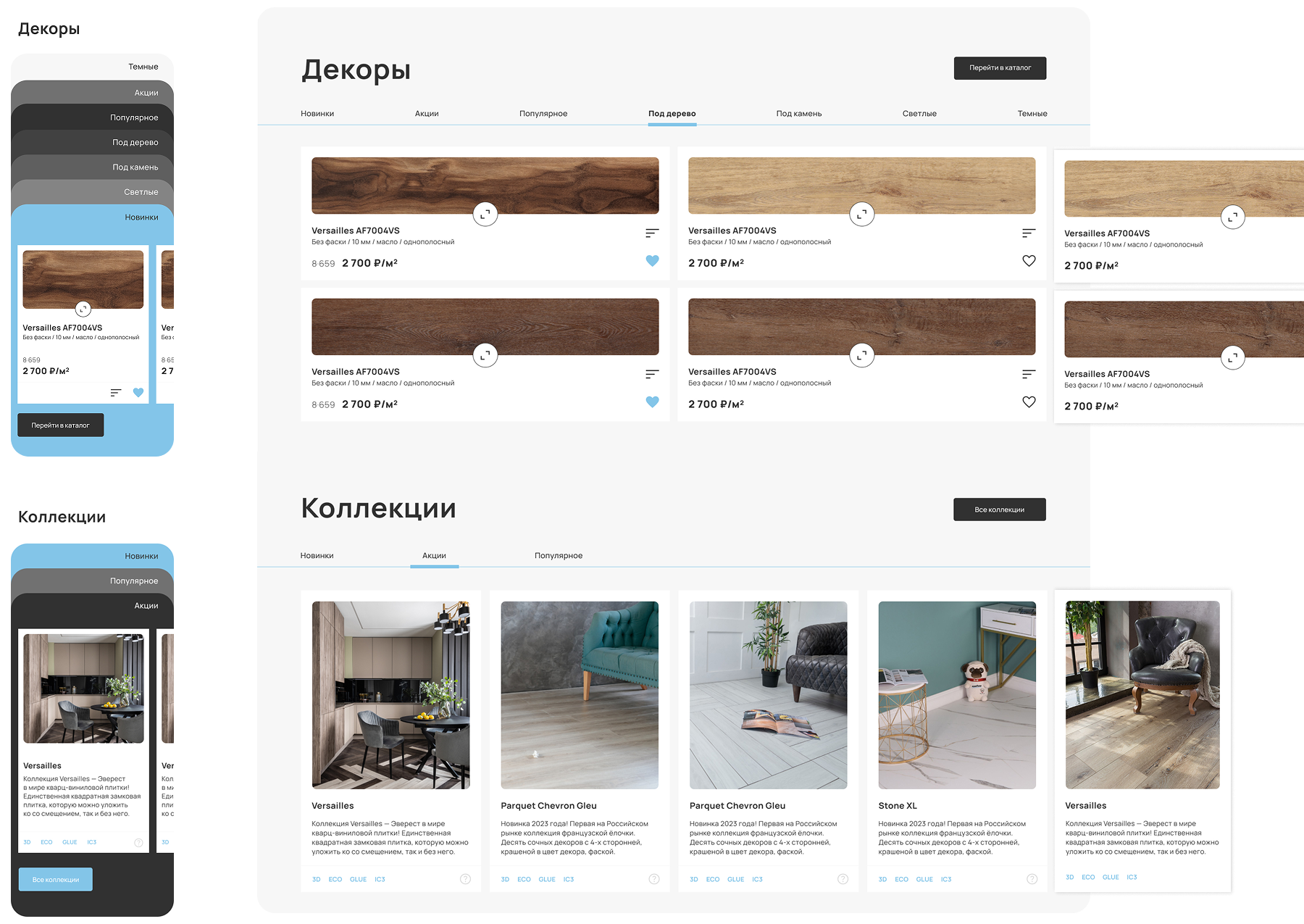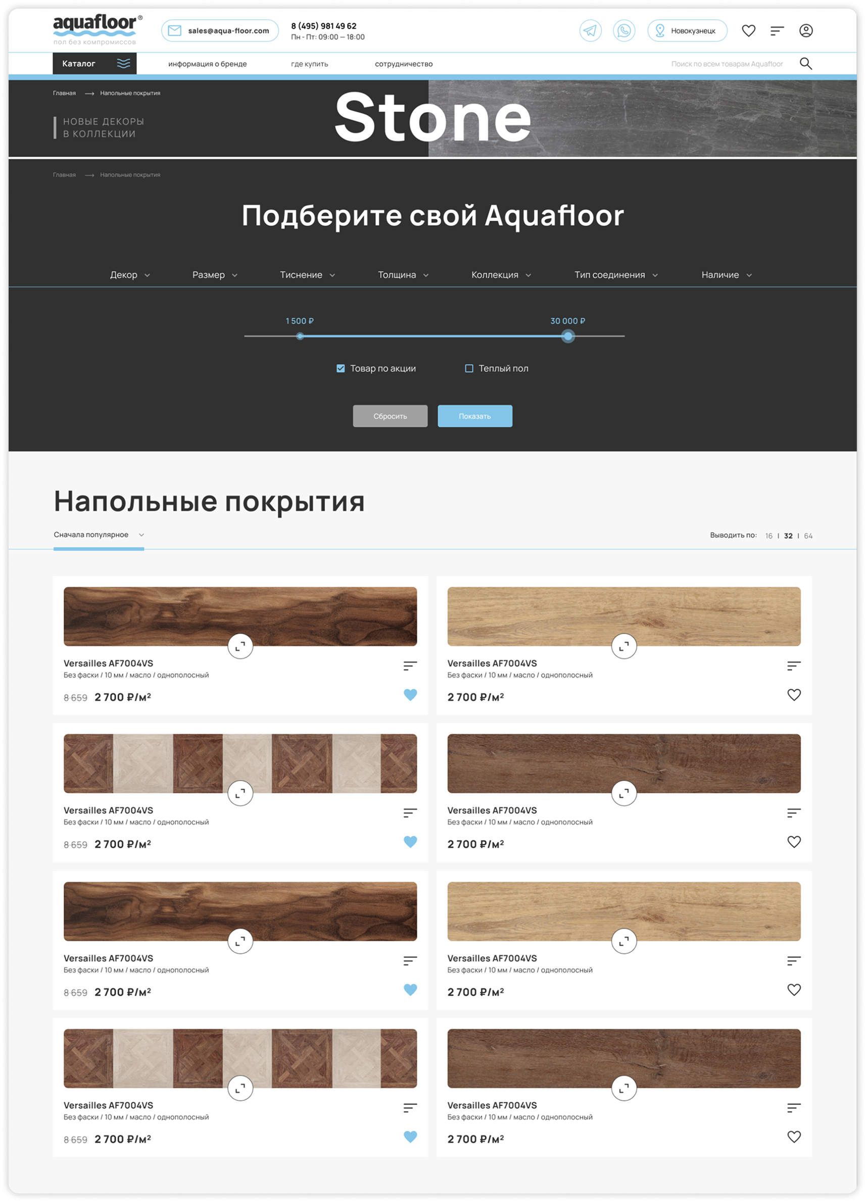 - Гибкая и быстрая фильтрация по основным свойствам товаров (коллекции, цвет, тип покрытия, цена и др.).