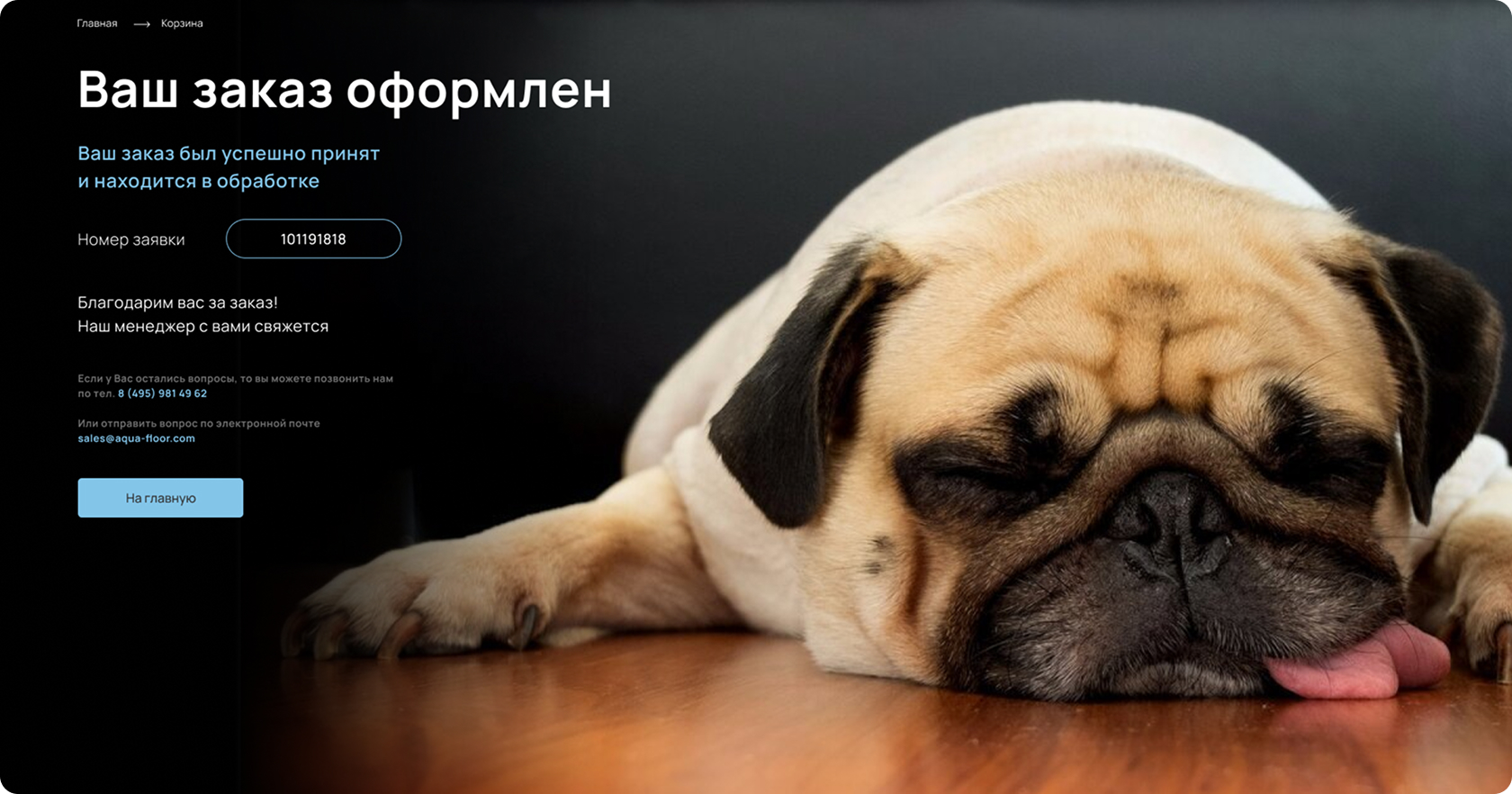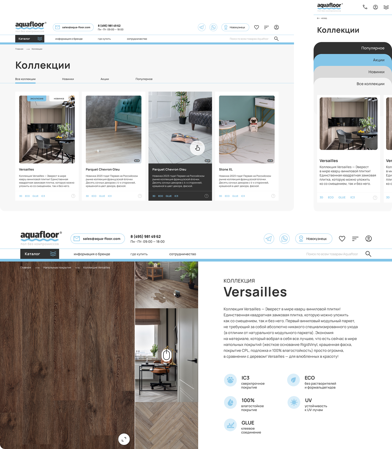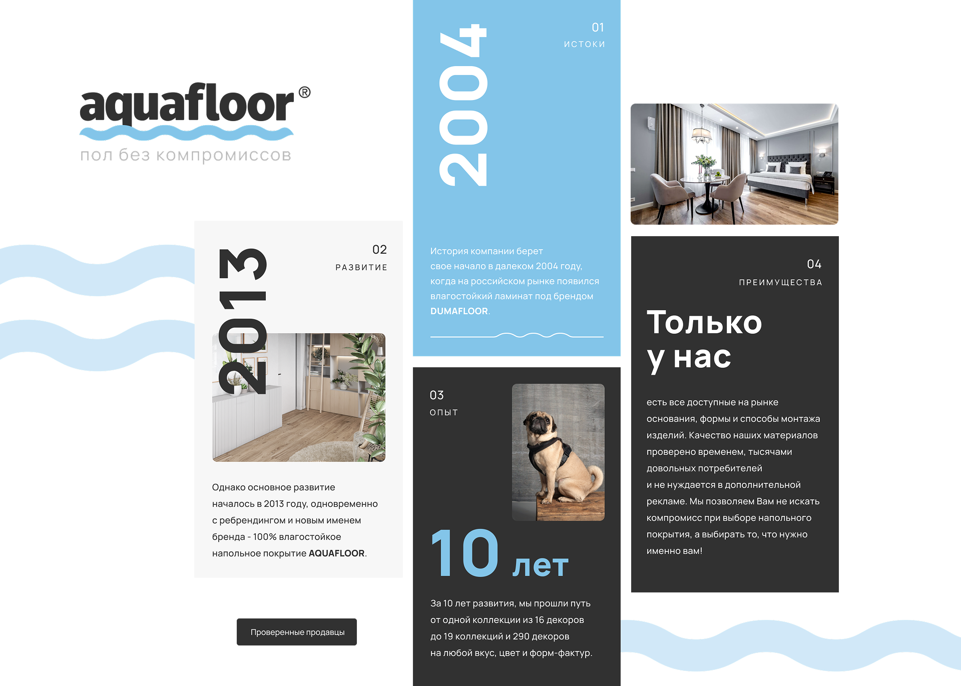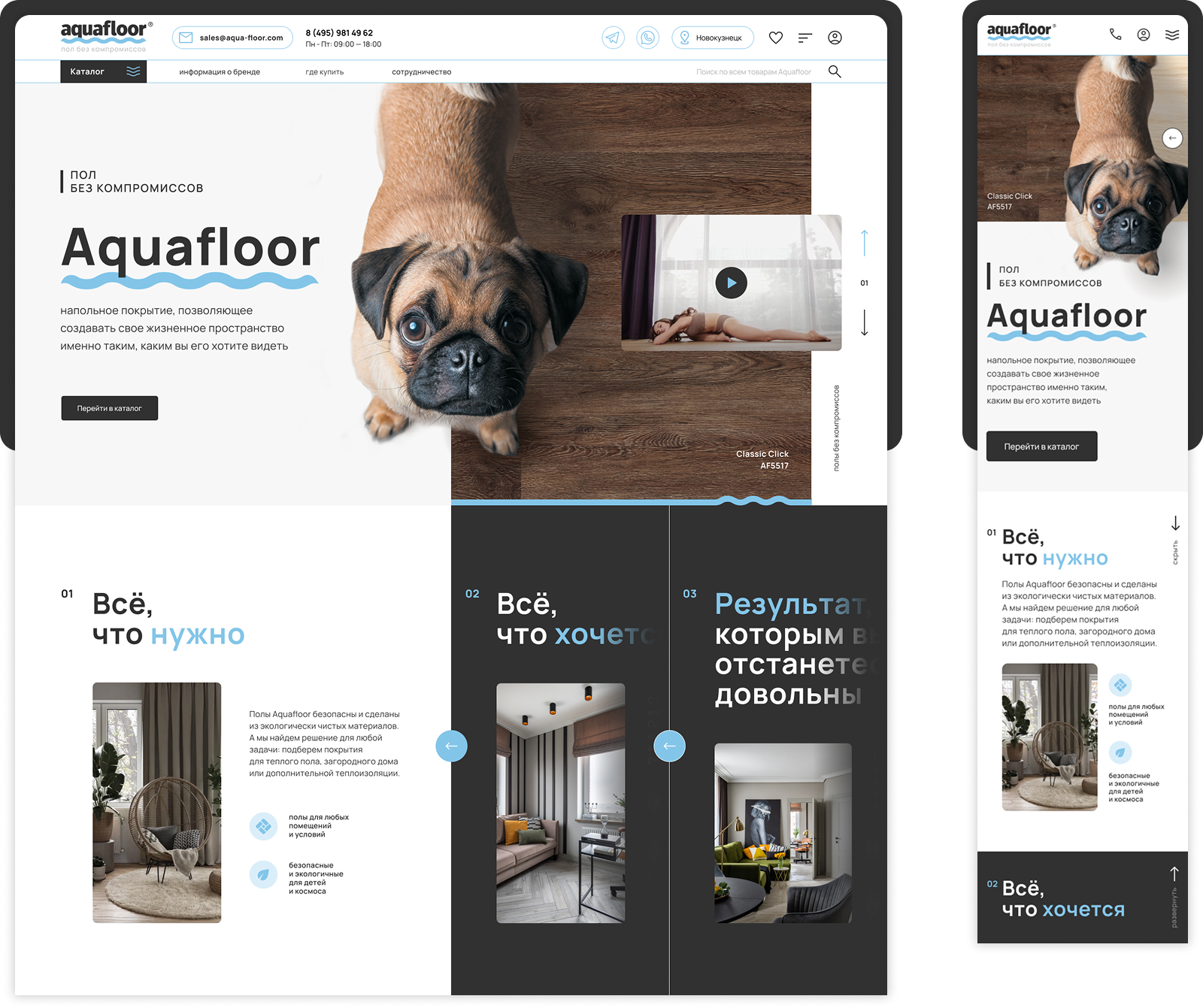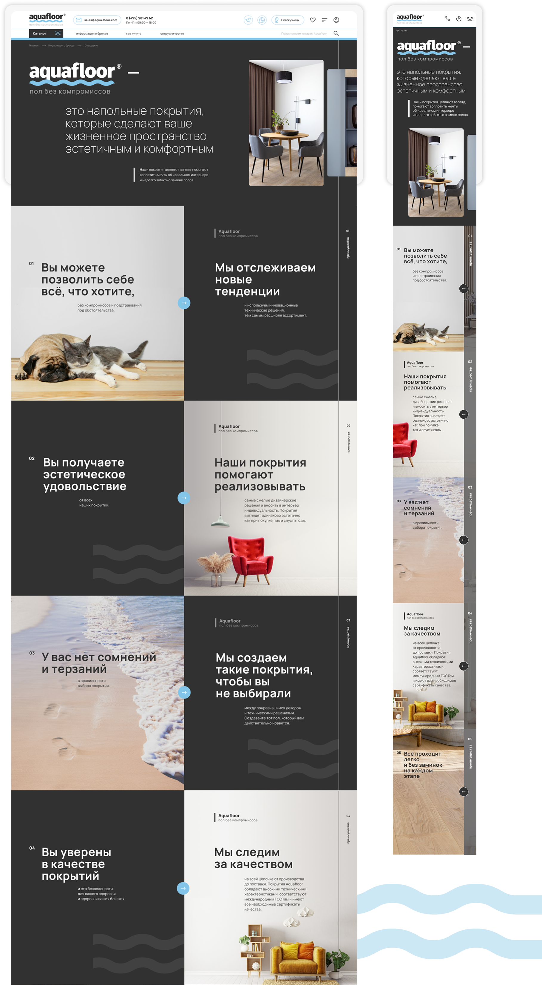 У компании уже был маскот, поэтому его необходимо было гармонично вписать в новый дизайн. Мопс на сайте подчеркивает индивидуальность бренда, усиливает доверие и симпатию покупателей, а также обеспечивает моментальную визуальную ассоциацию с продукцией Aqua-floor. Благодаря этому решению пользователи не просто узнают компанию по логотипу или названию, а моментально вспоминают доброжелательный, запоминающийся образ, с которым связывают положительный опыт взаимодействия с брендом. Такой подход выделяет компанию среди конкурентов и делает её более человечной и эмоционально привлекательной.