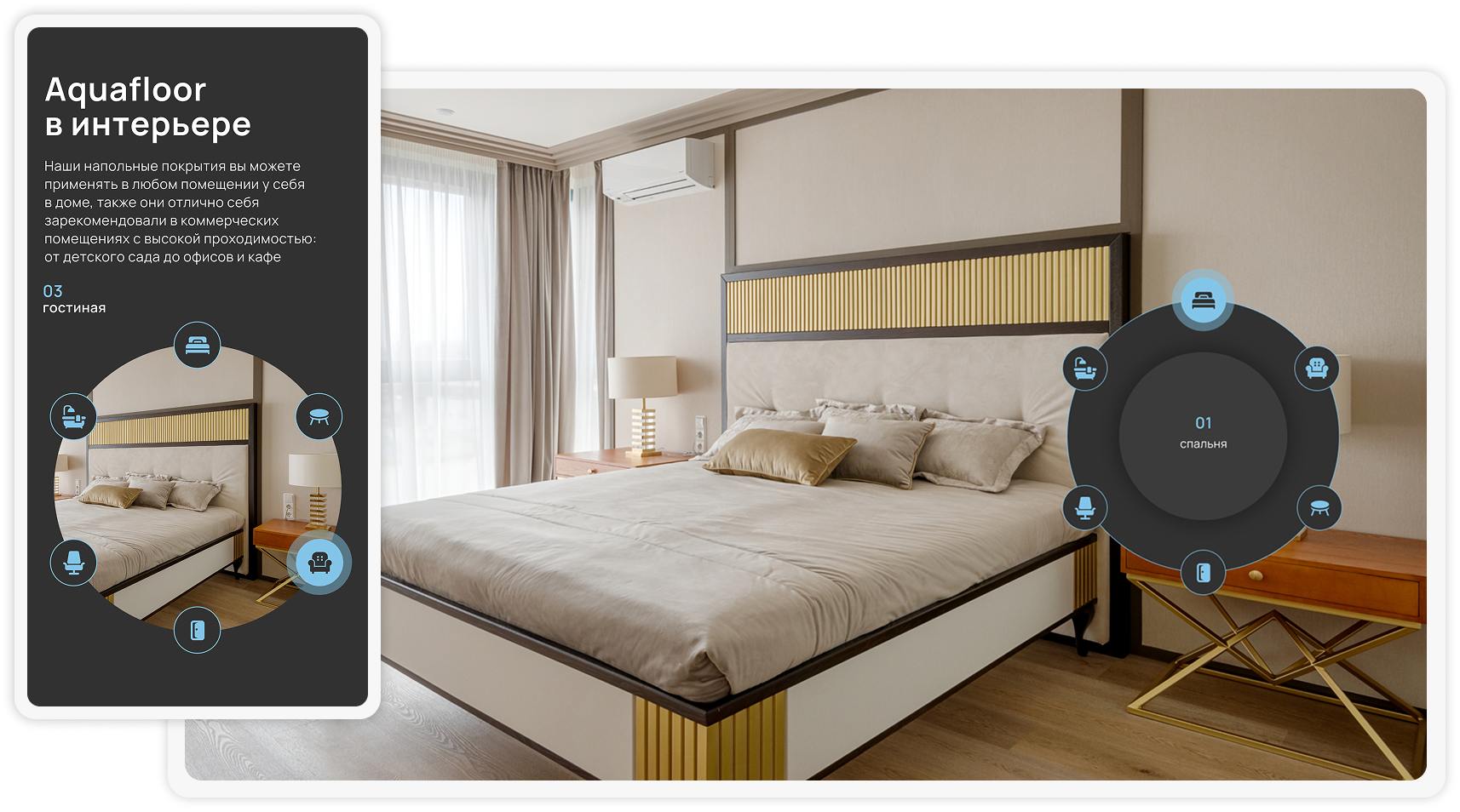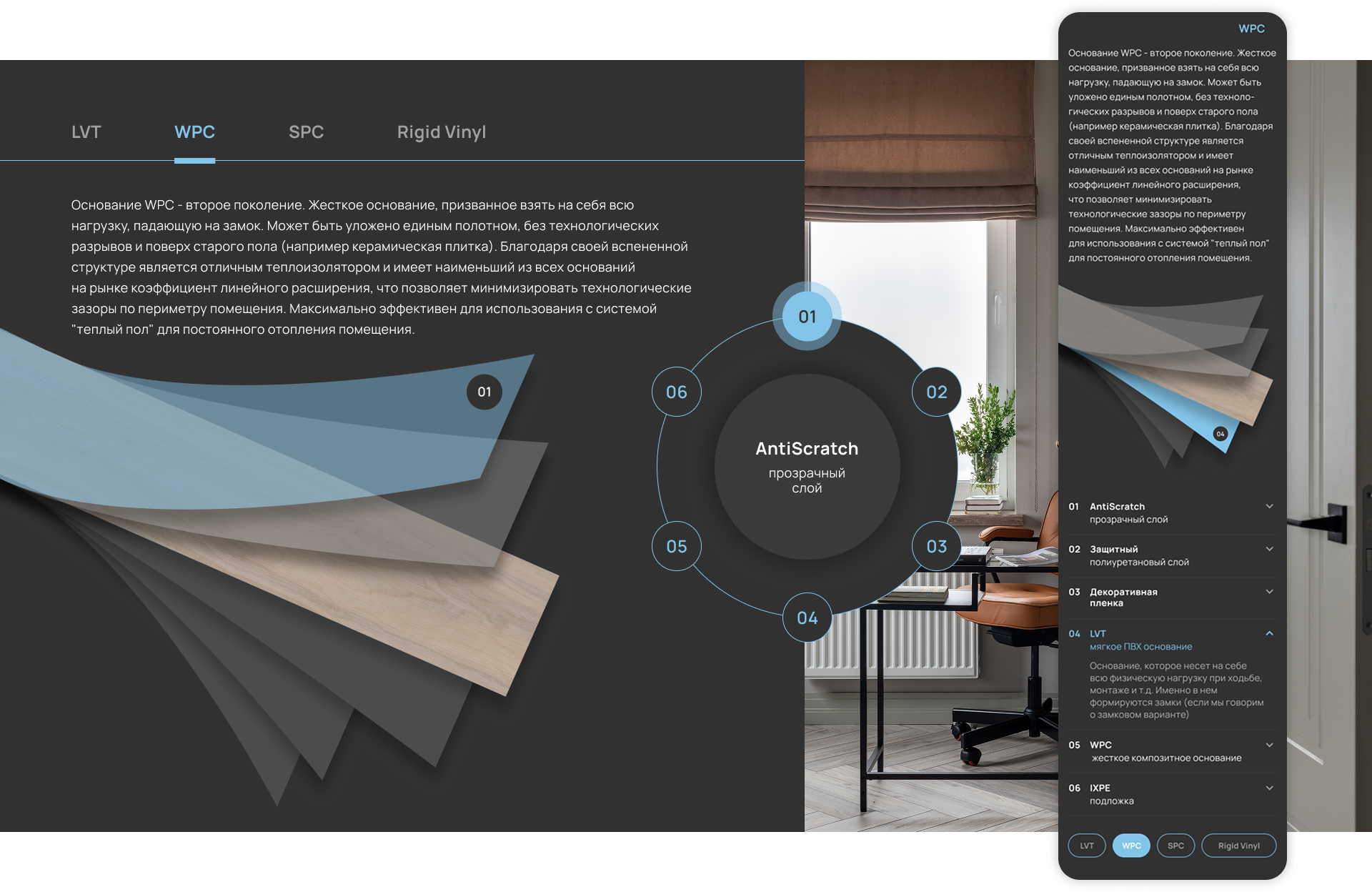 Специально был придуман интерактив, позволяющий покупателям более подробно изучить каждый слой напольных покрытий. В этом блоке удобно рассказывается о технологиях покрытий LTV, SPC, WPC, Rigid Vinyl, о преимуществах каждой, а также а каждом слое покрытия.